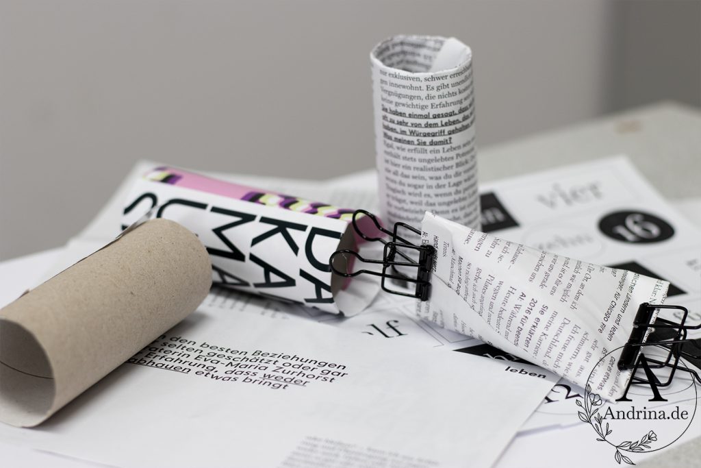 Wickle jede Papprolle in ein Stück Altpapier ein und fixiere die Enden mit Kleber. Die offenen Enden nach innen einklappen.