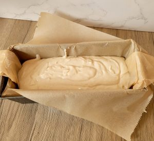 Teig in die Form füllen und glatt streichen. Im Ofen etwa 45–50 Minuten backen – je nach Ofen. Mit der Stäbchenprobe prüfen, ob der Kuchen durch ist.